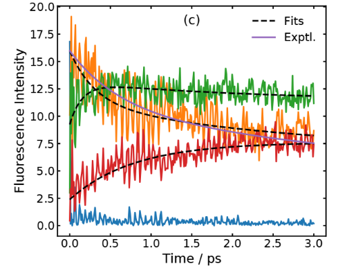 Comparison with fluorescence data supports this reinterpretation. The simulated time-dependent fluorescence decays reproduce the multi-exponential behavior observed experimentally. The fastest component (around 0.3 ps in the simulation) matches the rise of the Eigen complex, while the intermediate component (2 ps) corresponds to its slow reorganization. The agreement strengthens the conclusion that proton transfer is ultrafast, and the slower kinetics originate from structural relaxation.